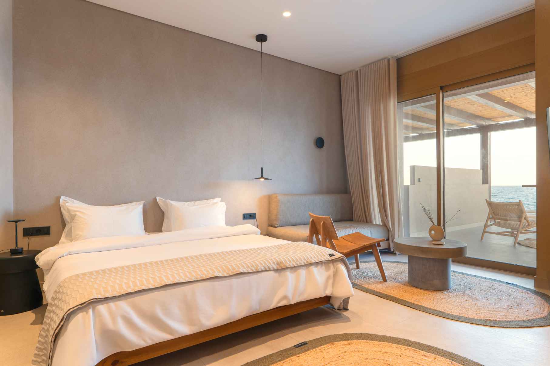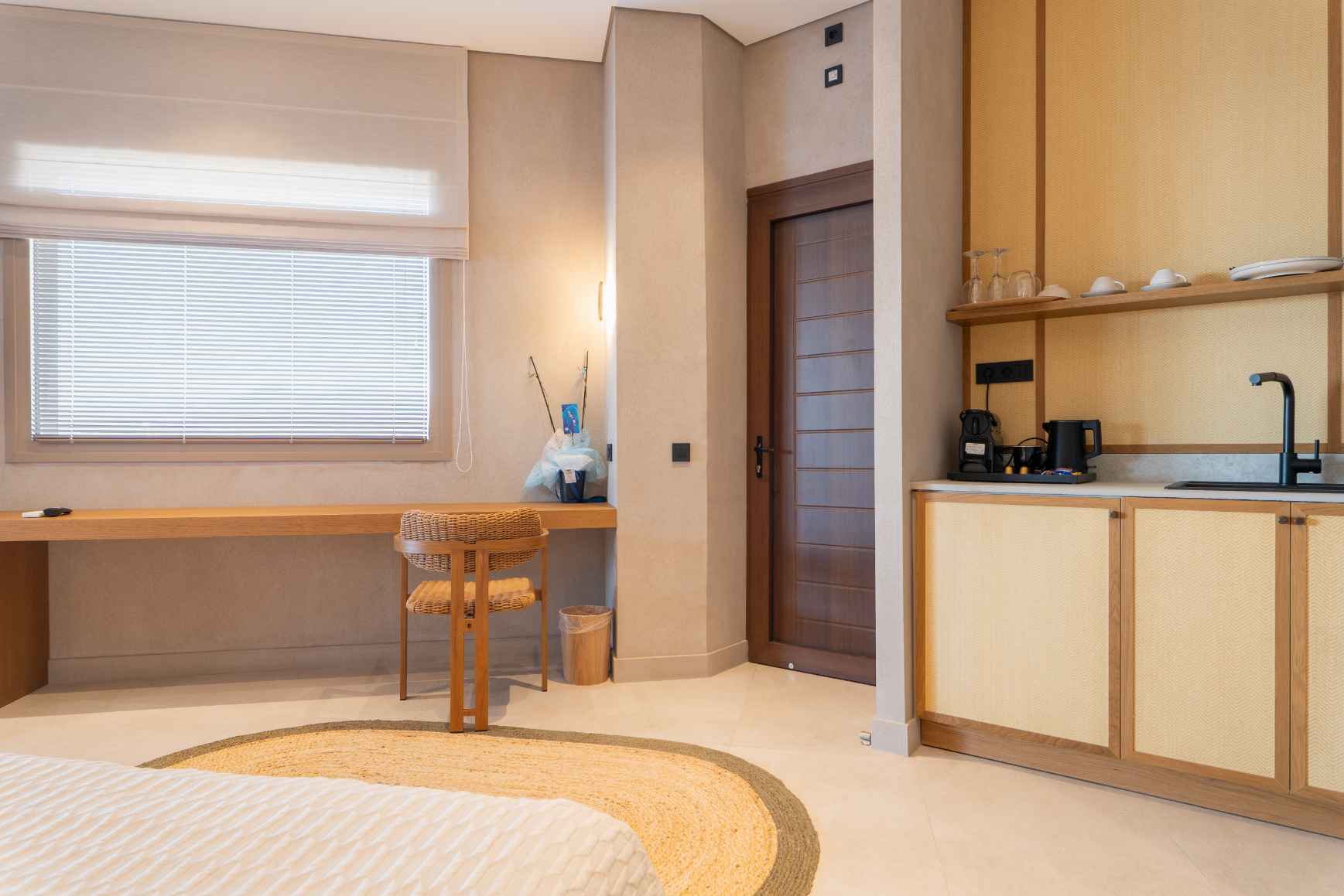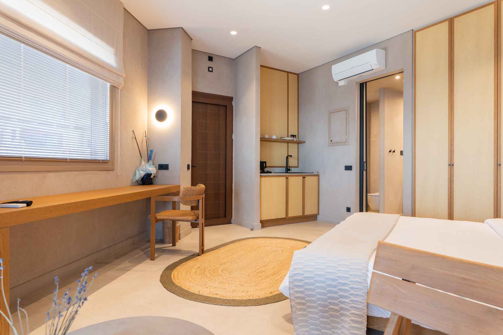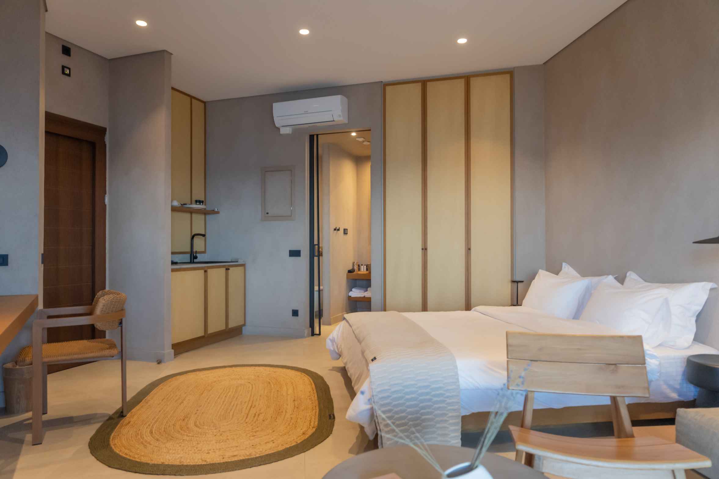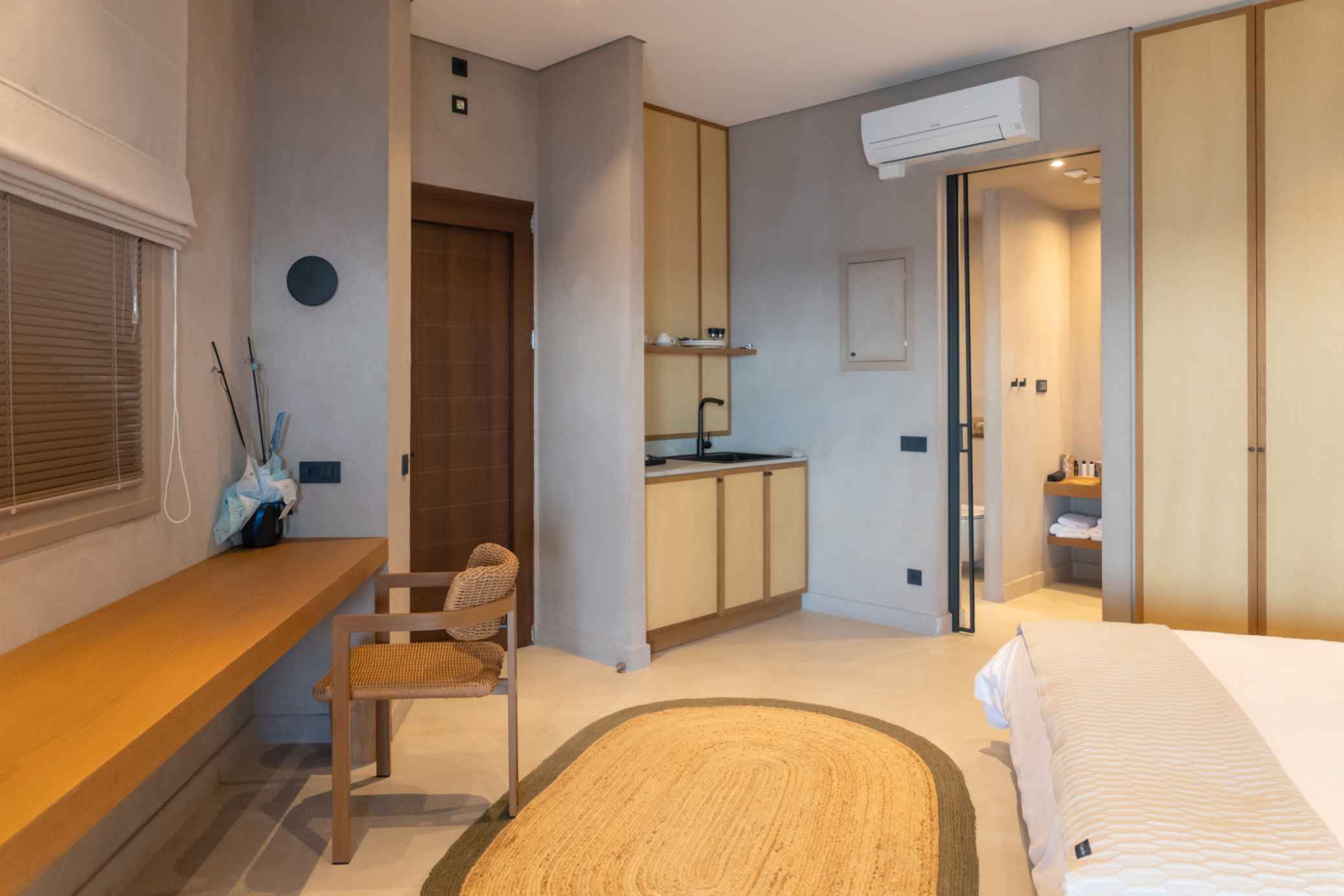 Κάθε σουίτα φιλοξενεί άνετα έως 2 επισκέπτες και διαθέτει διπλό κρεβάτι, πλήρως εξοπλισμένο μπάνιο με ντους, άνετο χώρο καθιστικού και ιδιωτικό μπαλκόνι ή αυλή με όμορφη θέα είτε στη θάλασσα είτε στον καταπράσινο κήπο.