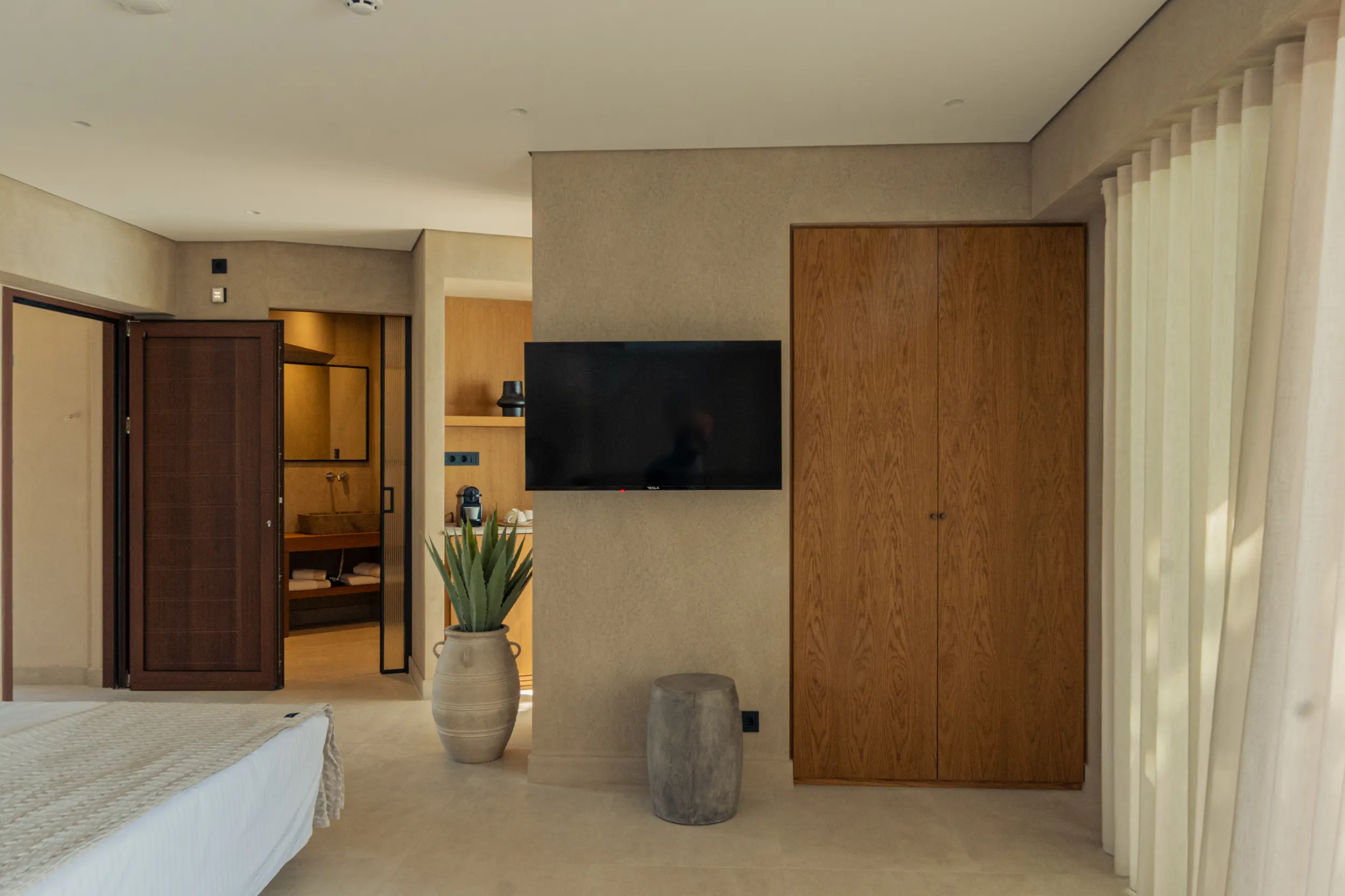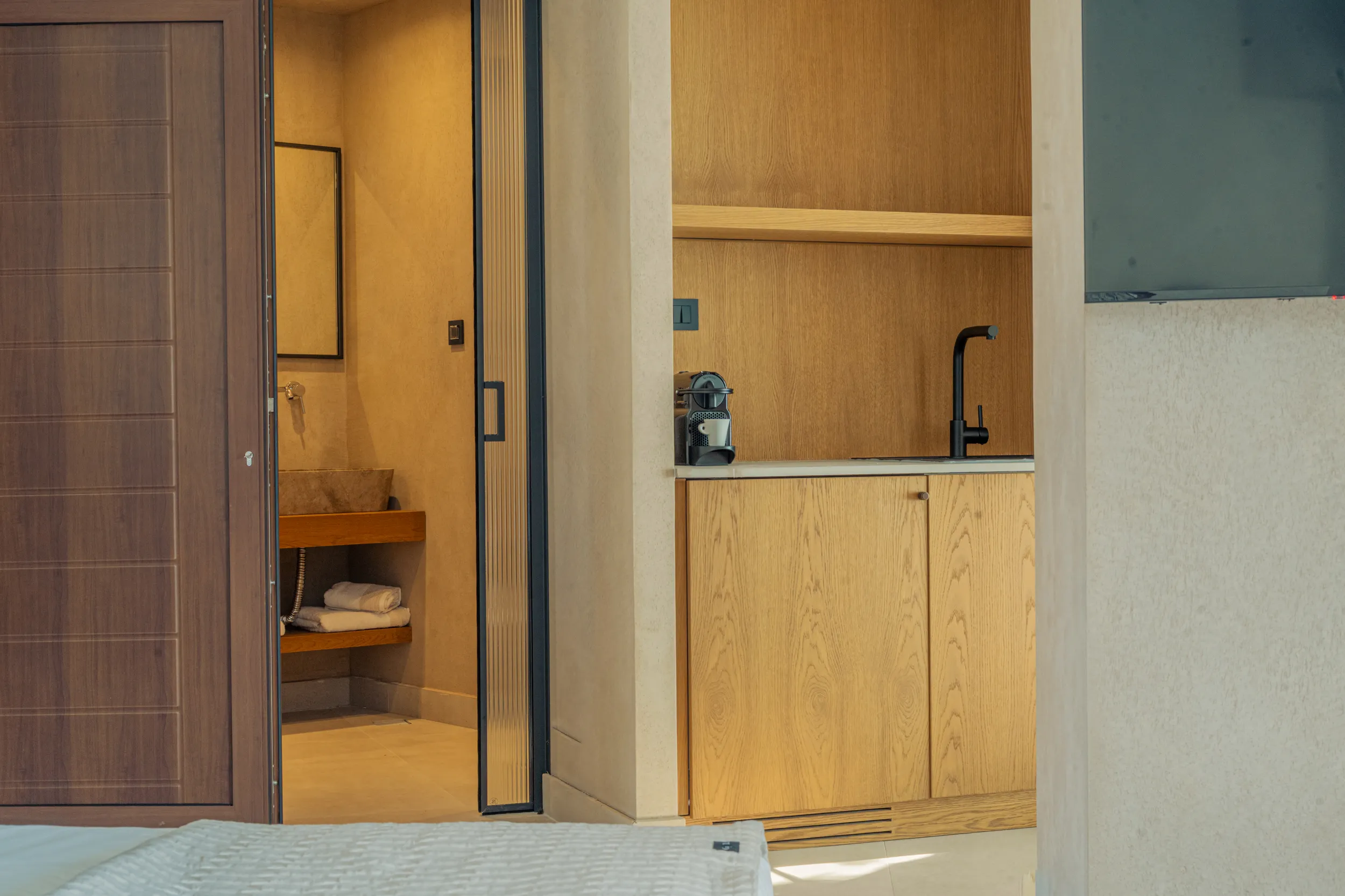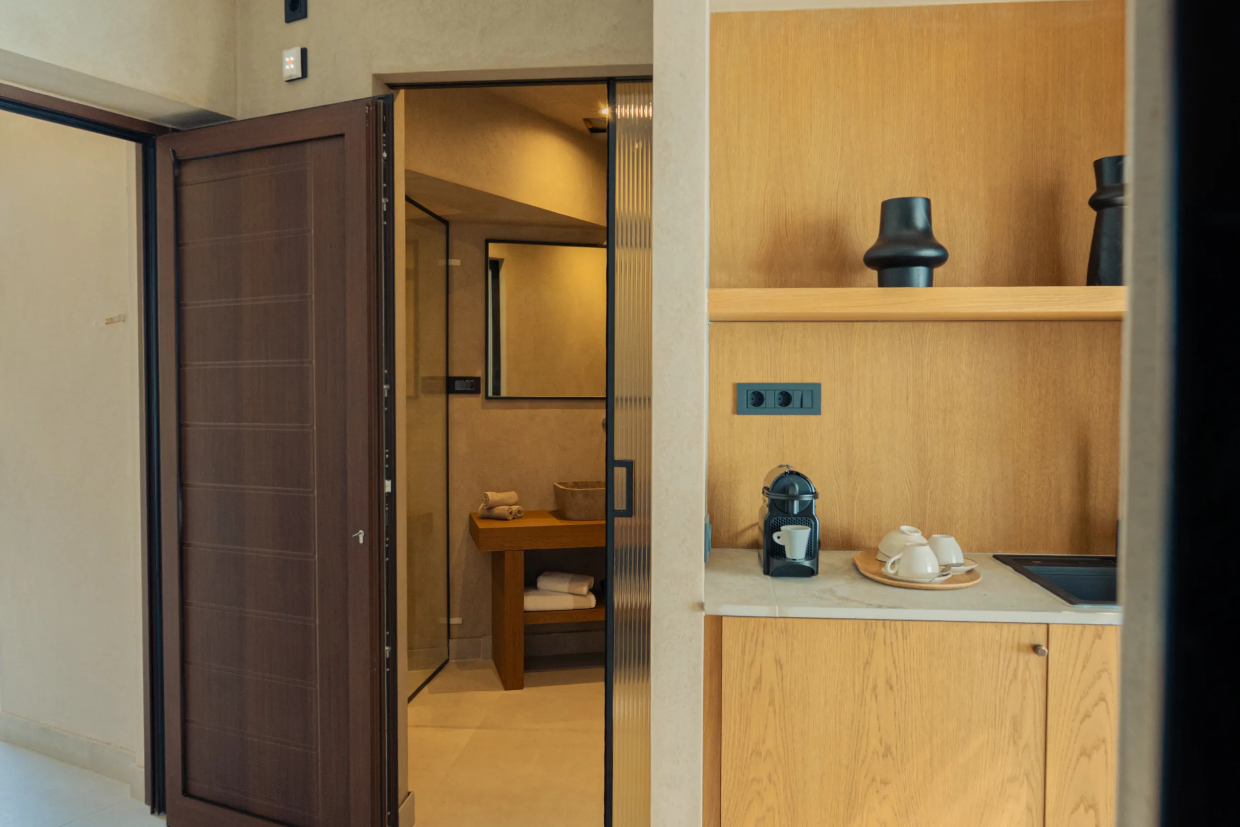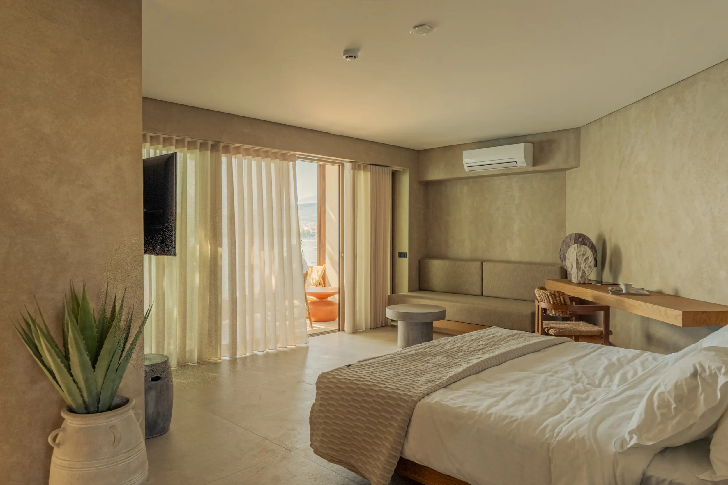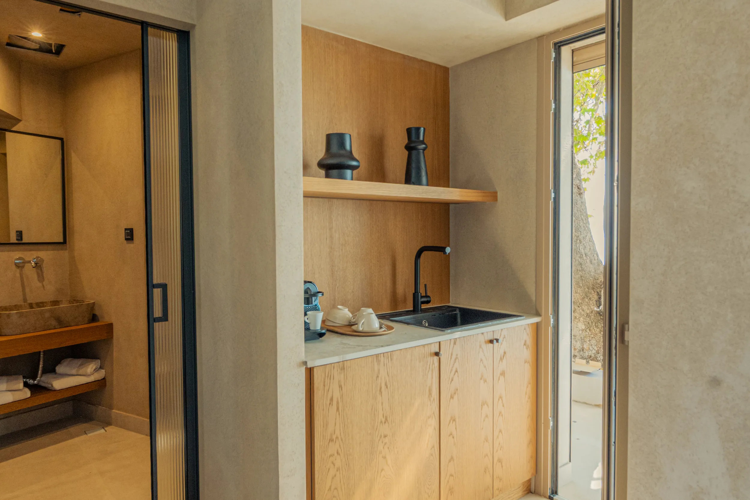 Κάθε σουίτα φιλοξενεί άνετα έως 2 επισκέπτες και διαθέτει διπλό κρεβάτι, πλήρως εξοπλισμένο μπάνιο με ντους, άνετο χώρο καθιστικού και ιδιωτικό μπαλκόνι ή αυλή με όμορφη θέα είτε στη θάλασσα είτε στον καταπράσινο κήπο.