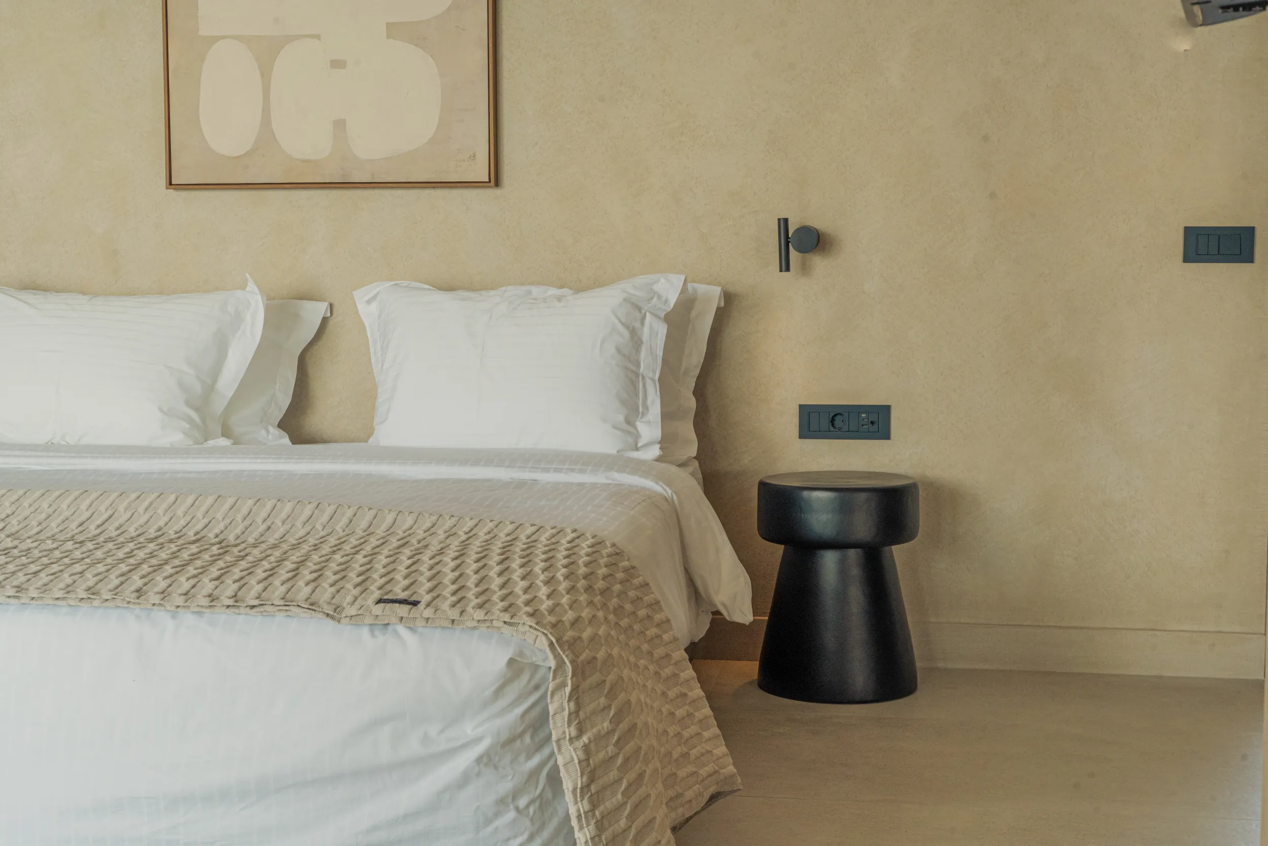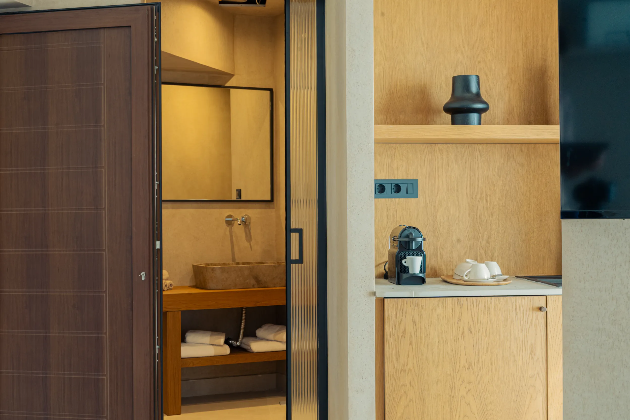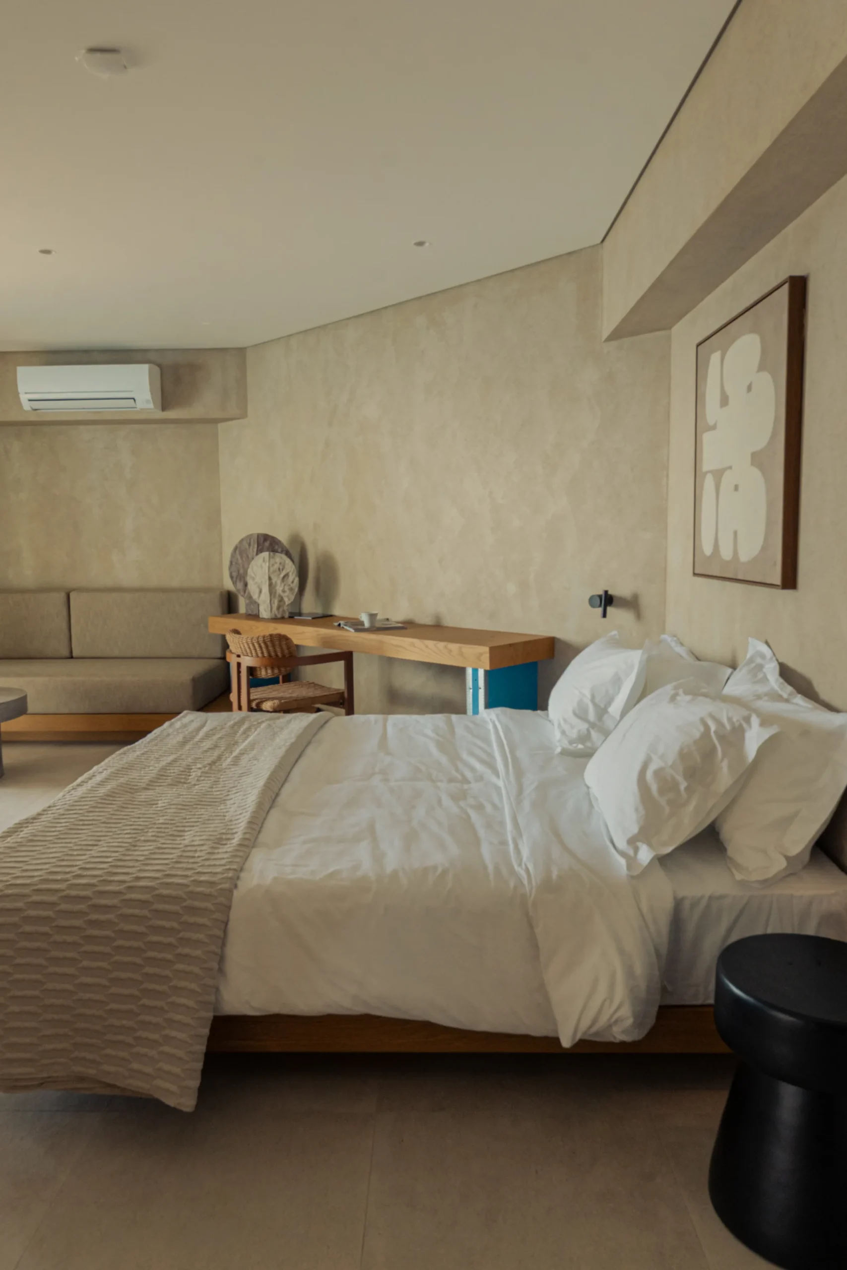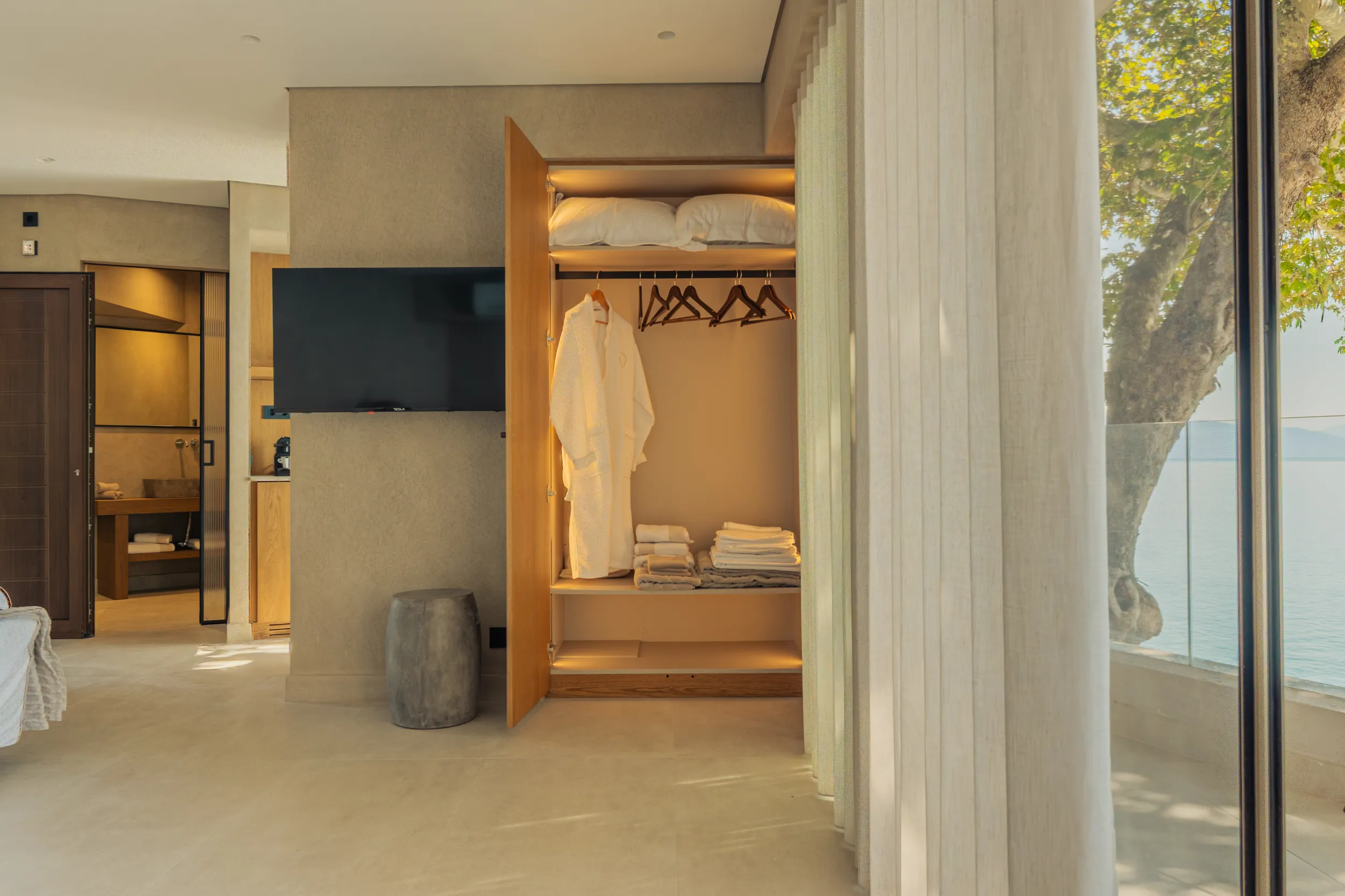 Κάθε σουίτα φιλοξενεί άνετα έως 2 επισκέπτες και διαθέτει διπλό κρεβάτι, πλήρως εξοπλισμένο μπάνιο με ντους, άνετο χώρο καθιστικού και ιδιωτικό μπαλκόνι ή αυλή με όμορφη θέα είτε στη θάλασσα είτε στον καταπράσινο κήπο.